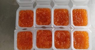 給湯温度を50度にしてボウルに湯と塩を入れ、生筋子をほぐす。簡単にほぐれた。買ってきた冷凍用容器は100グラムサイズが8つあり、ぴったり収まった。備え付けのタレを注ぎ入れ、冷凍庫に保存した。