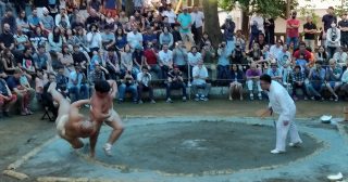 神社の土俵で奉納相撲をやっており、学生力士たちが「お肉ぷるんぷるんウォーズ」を戦っていた。ちょうど結びの一番だった。島木譲二二世みたいな風貌のあんちゃんと、素朴スチューデントの取組だった。ジョージが土俵際まで押し込んだところを、イノセントボーイが見事な腕捻りで投げ勝った。観客はどよめき、拍手していた。