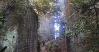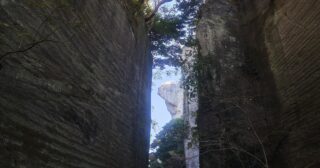 巨大な岩を縦にまっすぐ切り、切り通しのようになっている道を進む。道の果てには、目的地の『地獄めぐり』が見えた。