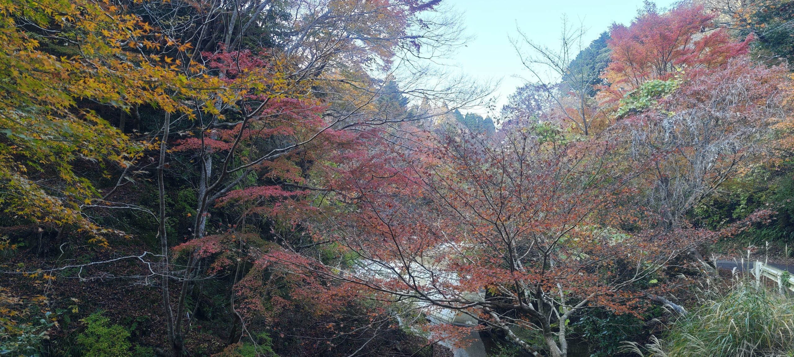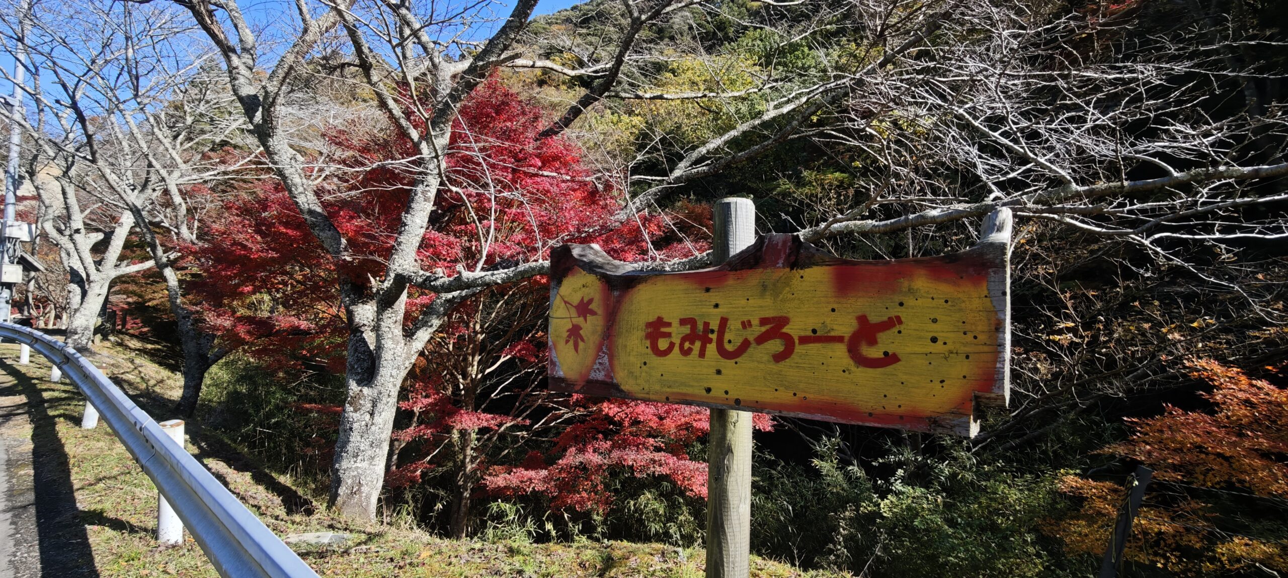 道を進むと、道の両脇に紅葉した木々を確認できるようになってきたが、人為的に植えられたもので、サイズの小さいものも多かった。この県道をもみじロードと称することに決めてから、観光価値を高めるために植えられたのではないかと思う。実際、休みの日は屋台の出店が並び、臨時駐車場も設営されるらしい。