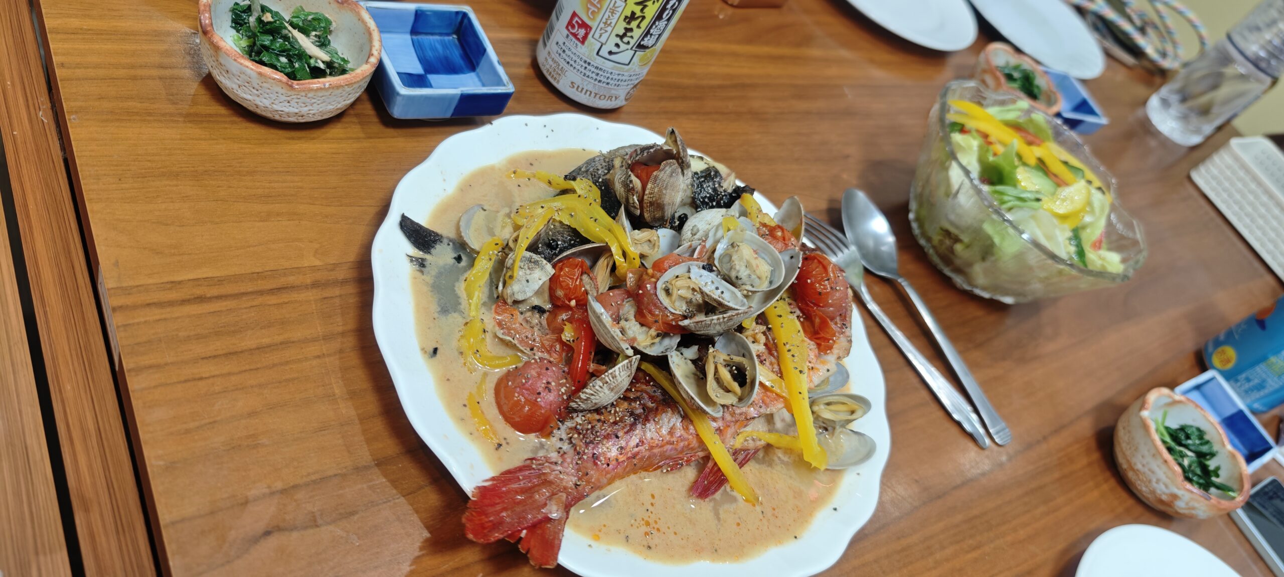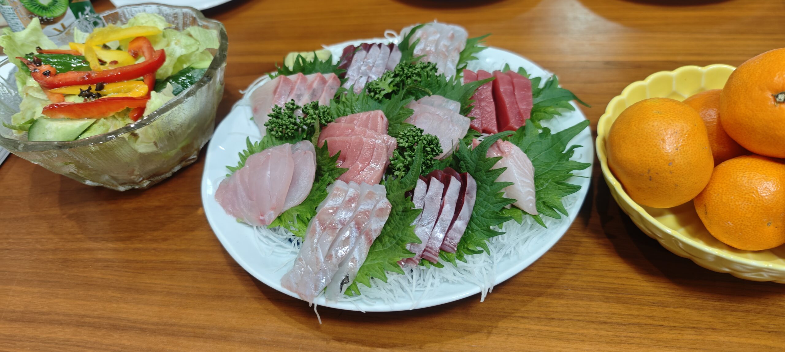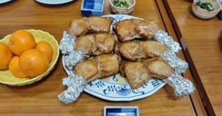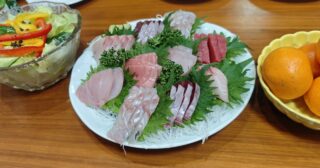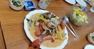 宿に戻ると、夕食の支度ができていた。クリスマス仕様だった。メジナとオジサンのアクアパッツァ、ローストチキン、刺身、揚げ物、ケーキが出た。刺身がめっぽう美味かった。