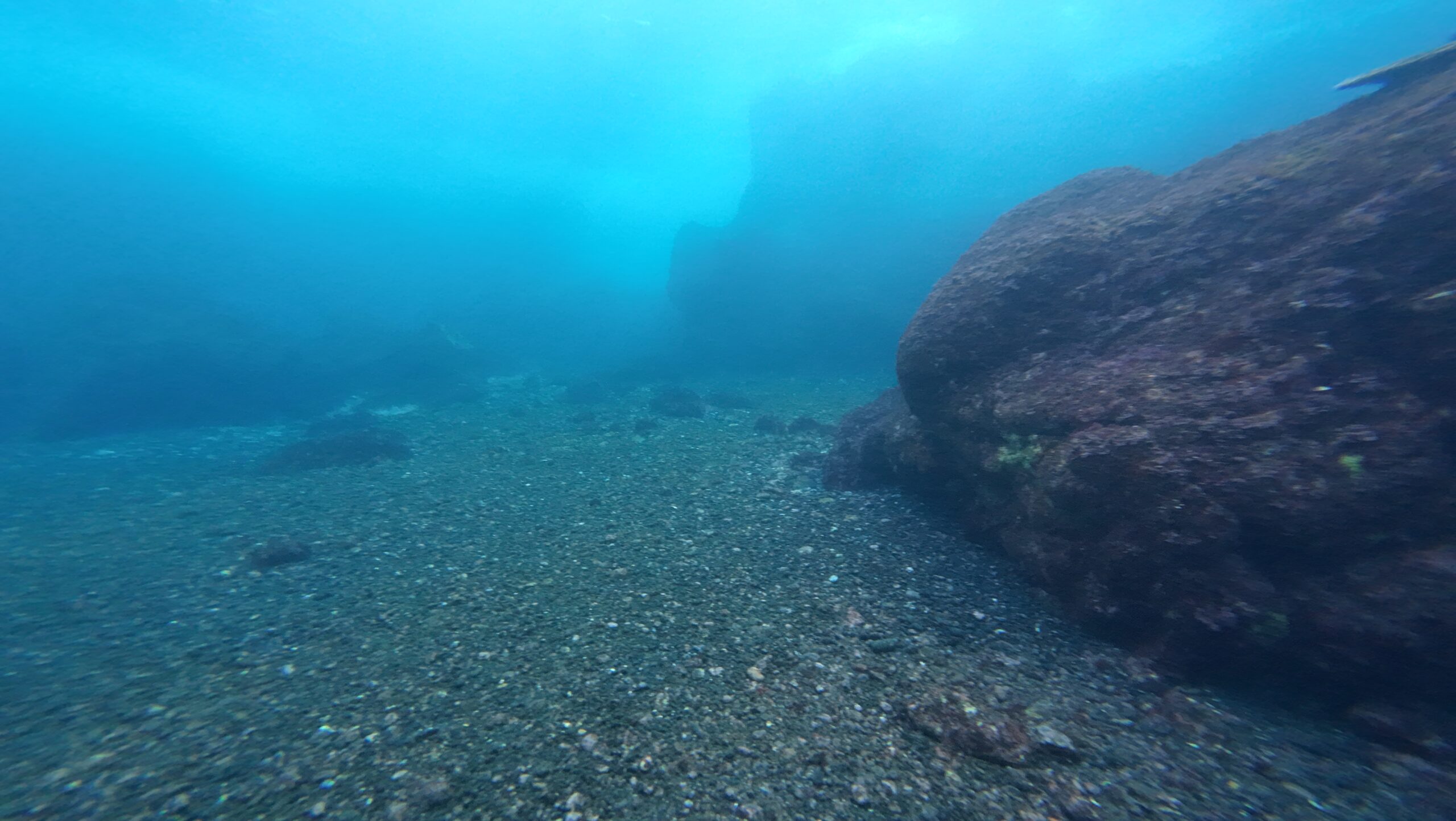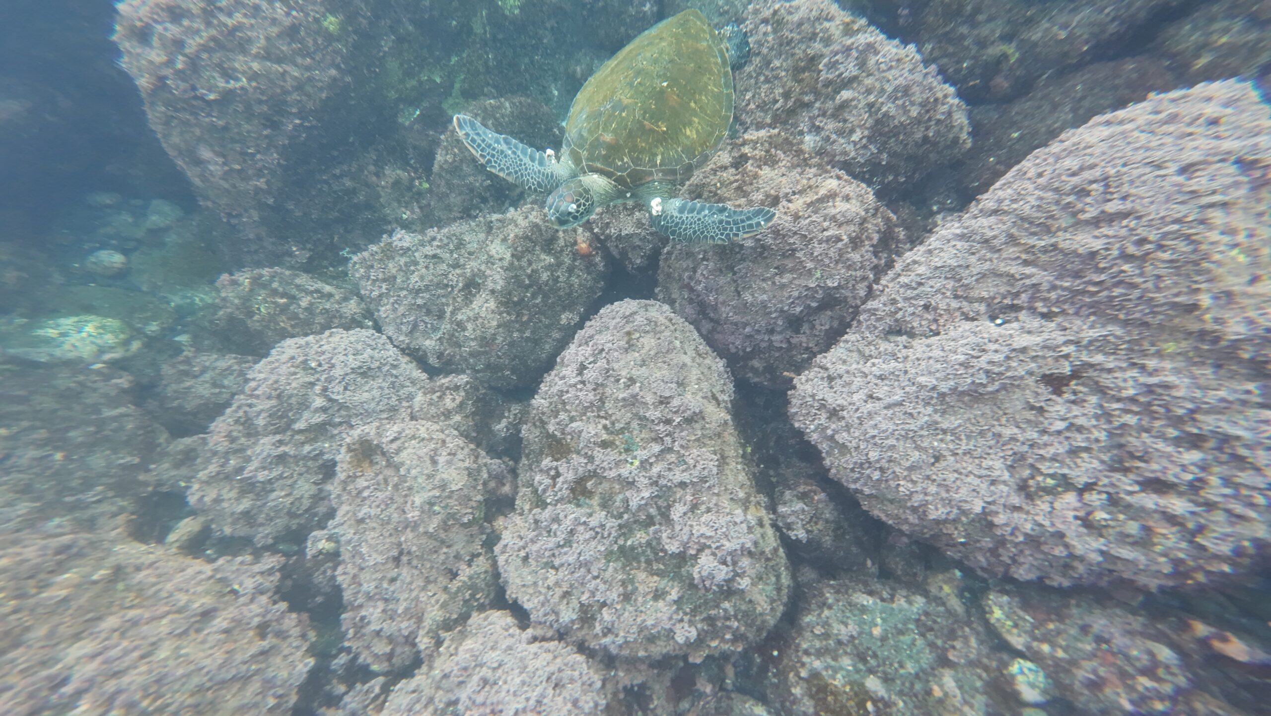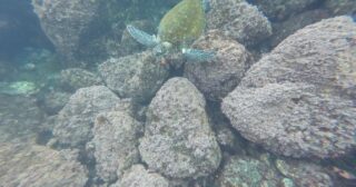 少し沖に行くと岩の傾斜があり、そこから20メートル以上まで潜降した。ウミガメはやはりたくさんおり、岩場の間を通り抜けたりするたびに、休んでいる個体に遭遇した。