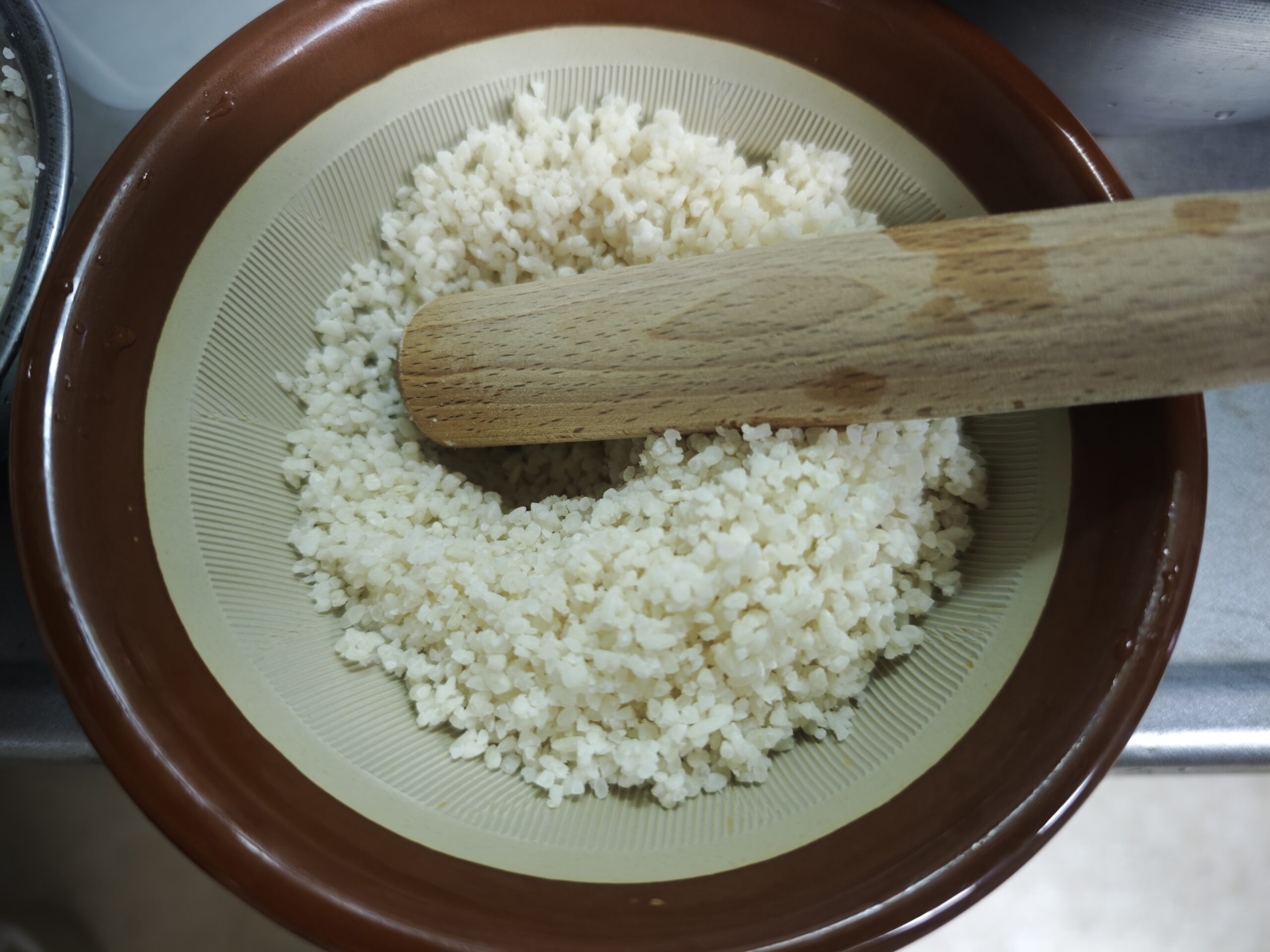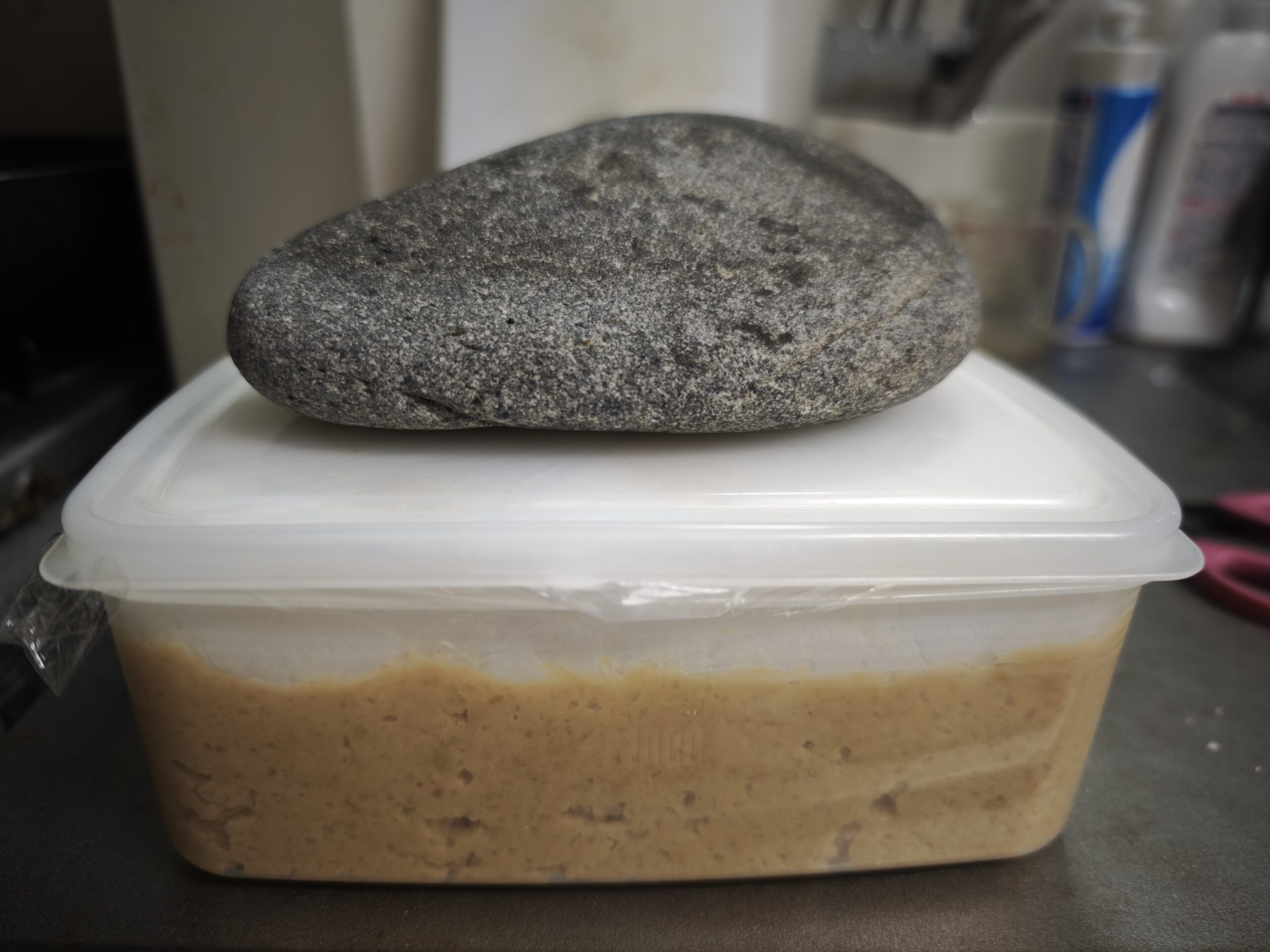 麹は3割の湯でふやかしてからすりつぶした。仕込み容器には一回り以上小さいタッパーを使った。重石は食塩1キロ分をポリ袋に入れるとサイズがちょうど良かった。